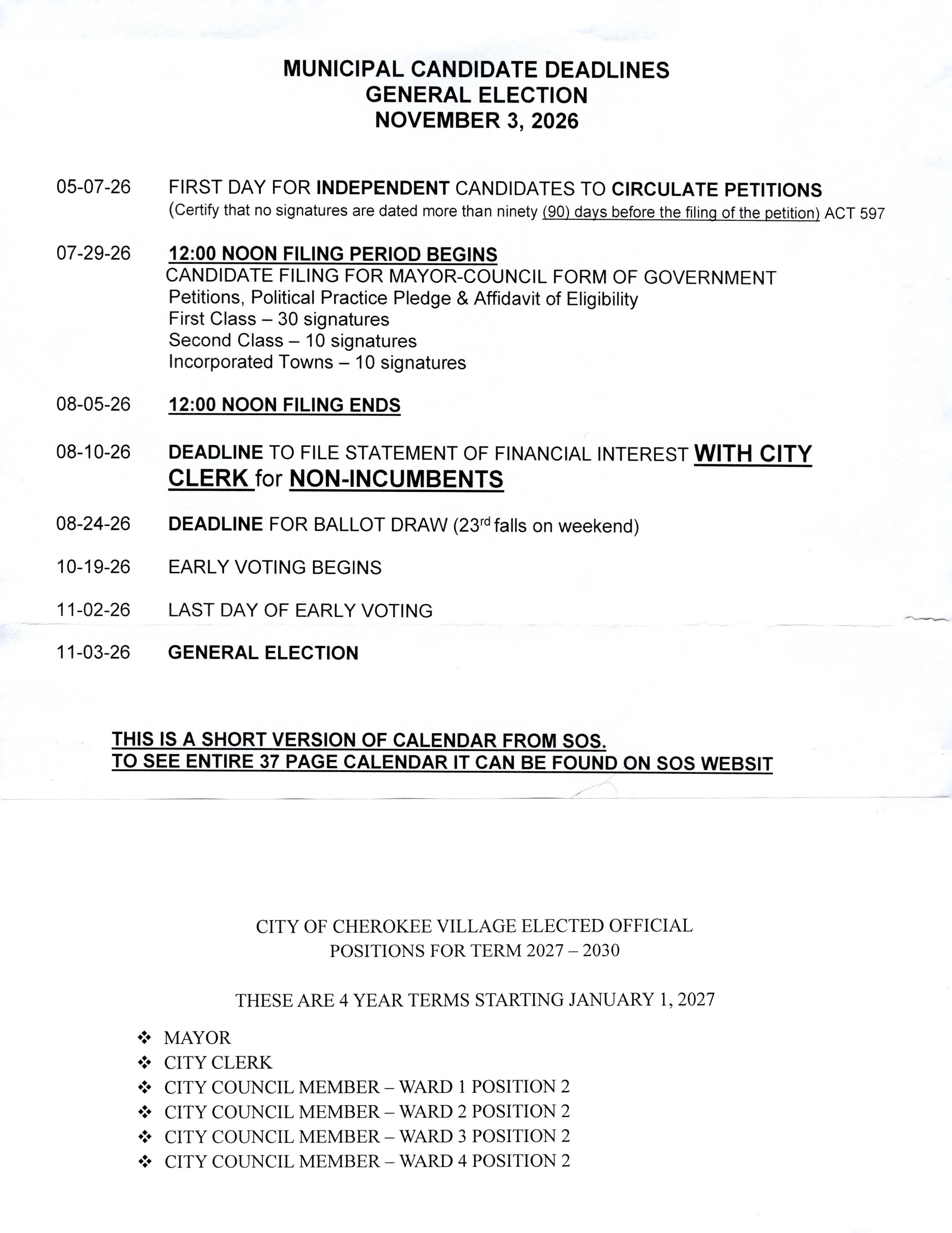 CITY BUSINESS - ALSO POSTED ON THE CITY OF CHEROKEE VILLAGE FACEBOOK PAGE